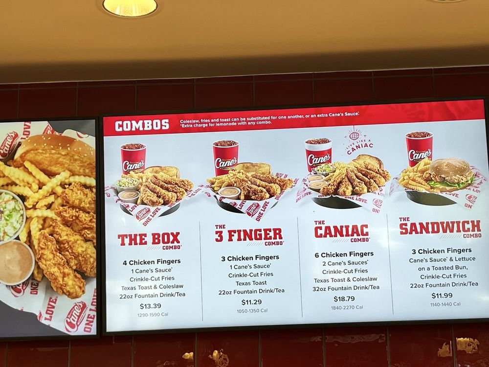 4 Chicken Fingers, 1 Cane's Sauce®, Crinkle-Cut Fries, Texas Toast, 22 oz. Fountain Drink. 1290-1720 cal.