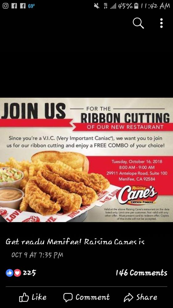 Welcome to Raising Cane's Chicken Fingers Menifee, where mouthwatering chicken wings and delightful sides take center stage! Nestled at 29911 Antelope Rd, this eatery offers a focused menu featuring their signature chicken fingers, celebrated for their juicy, tender meat and crispy breading. Guests can choose from a variety of combos—like the Caniac Combo with six chicken fingers, crinkle-cut fries, and the renowned Cane's Sauce®, crafted fresh daily.